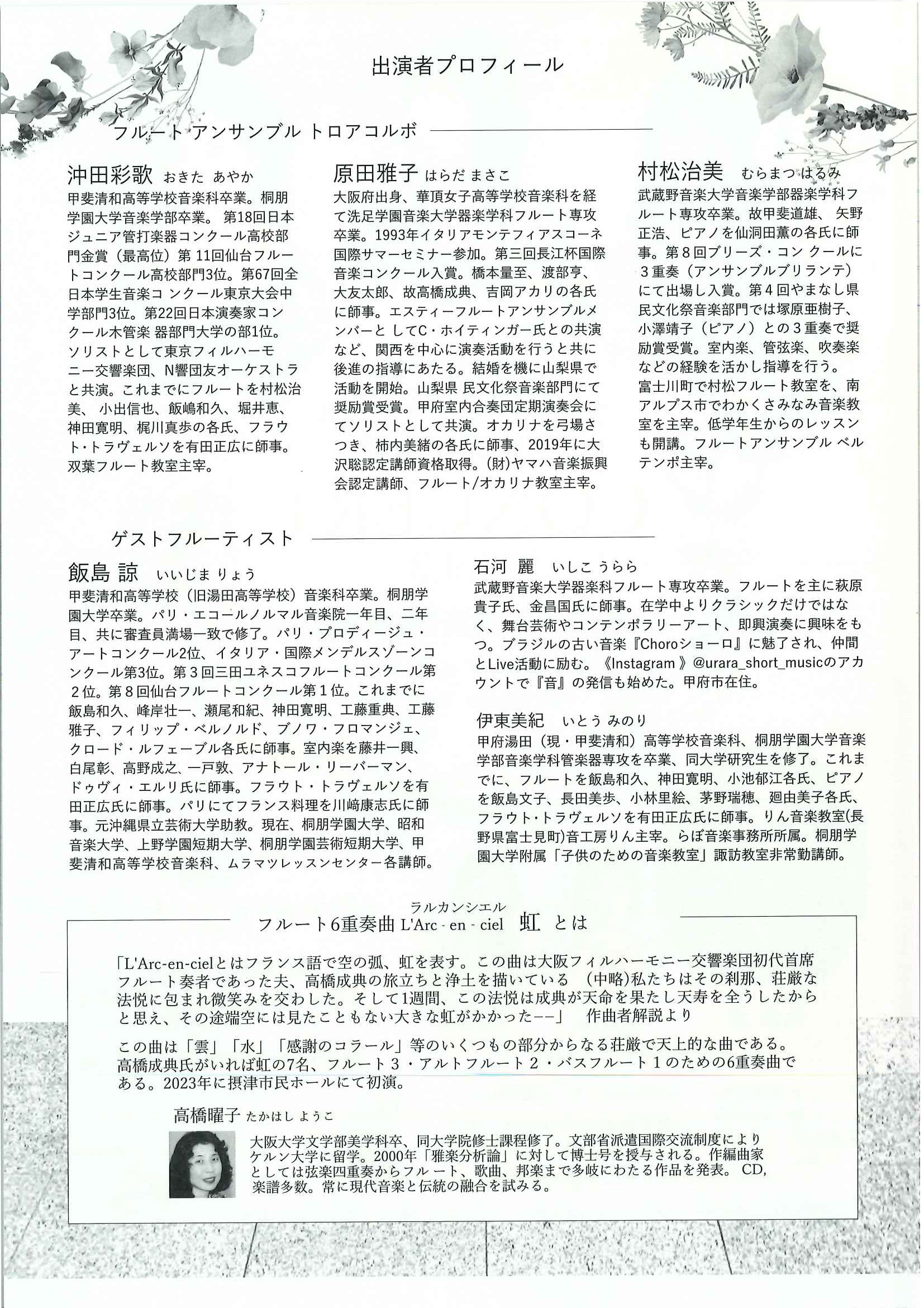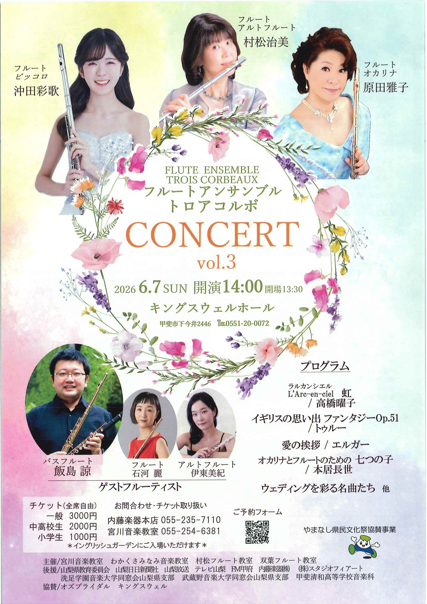 フルートアンサンブル トロアコルボ vol.3 6月7日(日) 開場:13:30 開演:14:00 前席自由 一般3.000円 中高生2.000円 小学生1.000円 当店でもチケットの販売がございます。